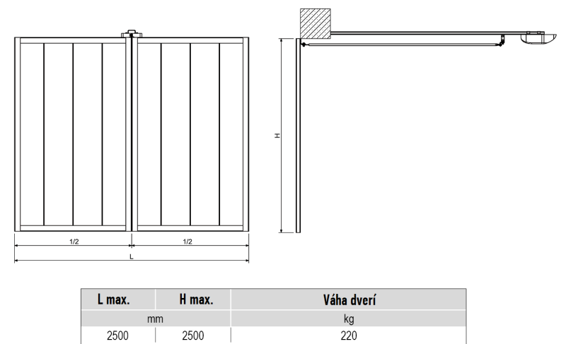 - Max. rozmery brány: 2500 mm (šírka celková) × 2500 mm (výška)