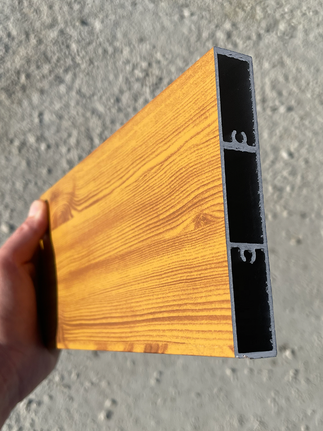 Hliník je odolný materiál s vysokou odolnosťou voči korózii, UV žiareniu a poveternostným vplyvom. Lamela je vyrobená z hliníka EN AW-6060 T66 a dodávaná v povrchovej úprave drevo dekor so štruktúrou.