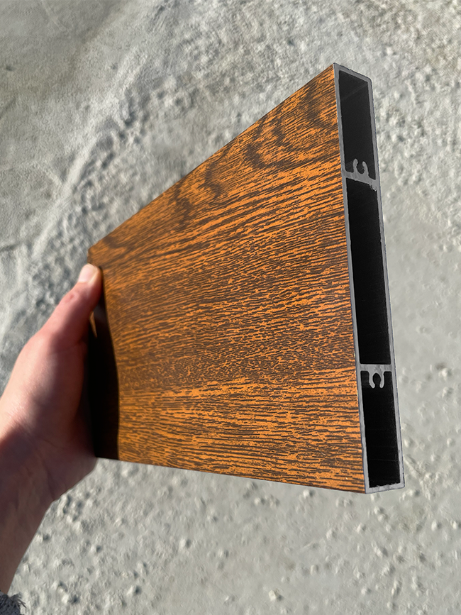 Všeobecne je hliník vyborný materiál s odolnosťou voči korózii, vplyvu počasia a má dlhú životnosť. Lamela je vyrobená z hliníku normy EN AW-6060 T66 a je dodávaná s povrchovou úpavou vo farbe drevo dekor.