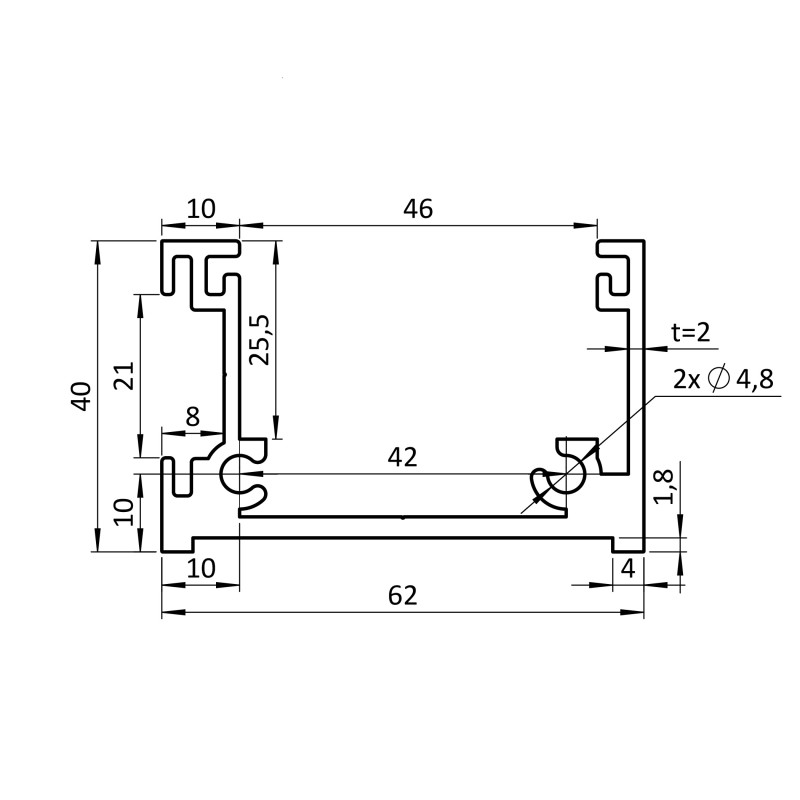 Popis produktu Hliníkový montážny profil 62x40mm, pre uchytenie výplne