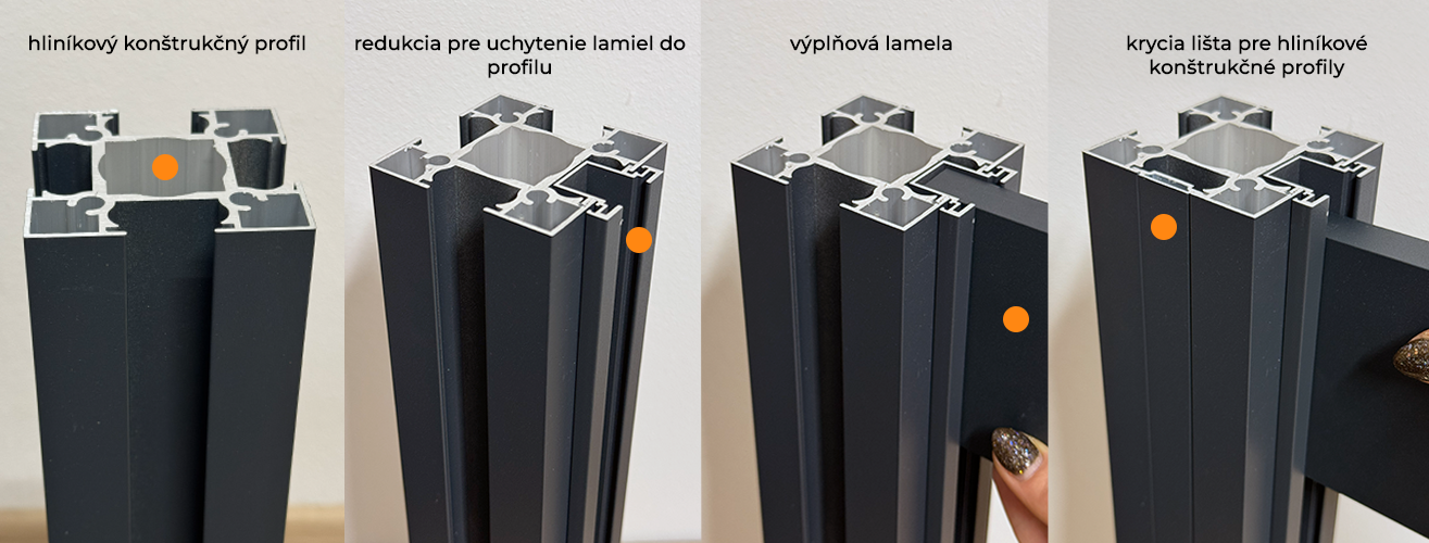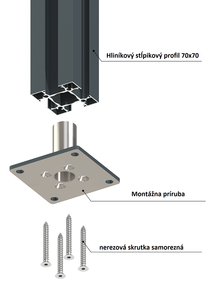 Stĺpik sa kotví do podkladu pomocou montážnej príruby a štyroch samorezných skrutiek. Po osadení lamiel alebo profilov sa vrchná časť zakončuje hliníkovou krytkou.