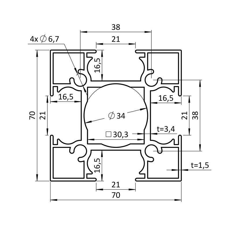 Hliníkový profil so štvorcovým prierezom 70×70 mm, v povrchovej úprave antracit RAL7016 so štruktúrou, predstavuje univerzálne riešenie pre montáž oplotenia alebo iných konštrukčných prvkov. Je navrhnutý na priame uchytenie lamiel alebo profilov so šírkou 20 mm, prípadne 16 mm pri použití redukcie.