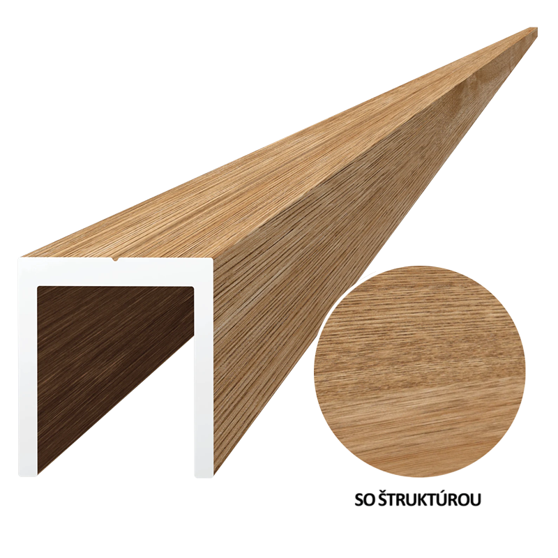 Popis produktu Hliníkový uchytávací profil pre lamely, tvar U, šírka 20,5 mm, s povrchovou úpravou drevo dekor so štruktúrou, buk