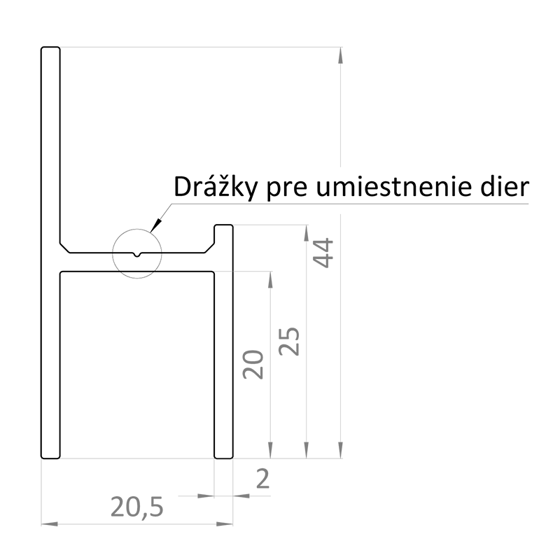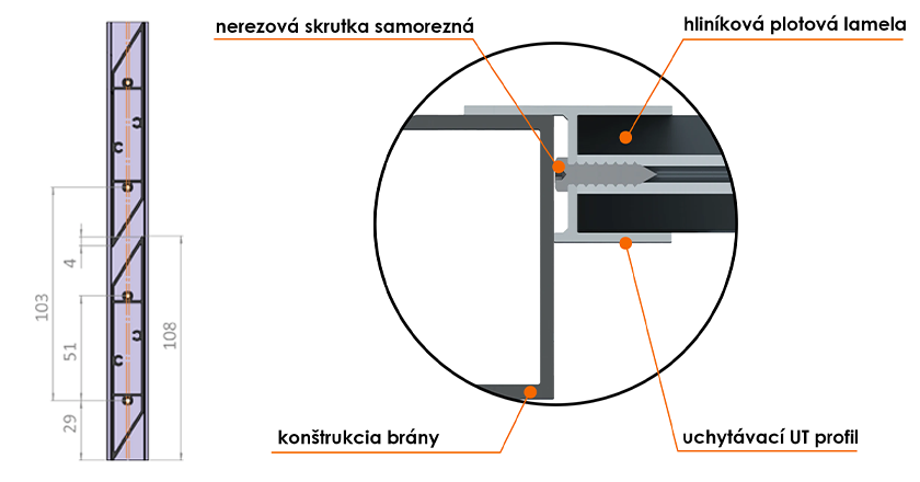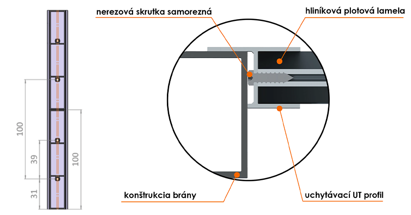Hliníkový uchytávací profil pre plotové lamely má tvar UT, čiže je vhodný pre montáž popred stĺpiky na bráne, plote, alebo inom otvore. Vonkajšia šírka profilu je 20,5 mm, presah je 44 mm a dĺžka 2 m, 3 m alebo 6 m.
