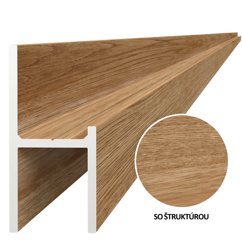 Popis produktu Hliníkový uchytávací profil pre lamely, tvar UT, šírka 20,5 mm, s povrchovou úpravou drevo dekor so štruktúrou, buk
