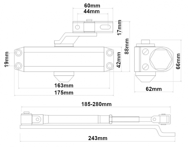 Hydraulický zatvárač pre interiérové aj exteriérové dvere s max. dĺžkou 900mm a max. váhou 60kg. Rozmery zatvárača sú 163x42x62mm a prevedenie je INOX AISI304, farba šedá.