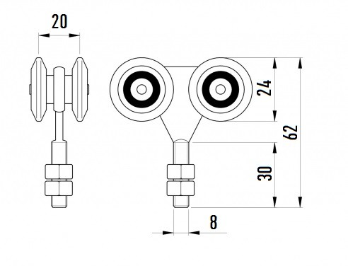 V spodnej časti je závit M8 pomocou ktorého je možné viacerými spôsobmi ukotviť vozík na hornú časť závesnej brány - napríklad pomocou kotviacej príruby s ložiskom. Podľa spôsobu uchytenia je možná dodatočná výšková regulácia na závite. Dodávané vrátane matíc.