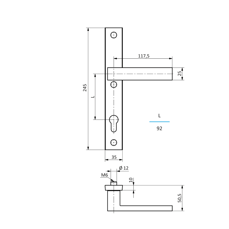 Kľučka s dvomi štítmi, brúsený elox, rozteč 92mm