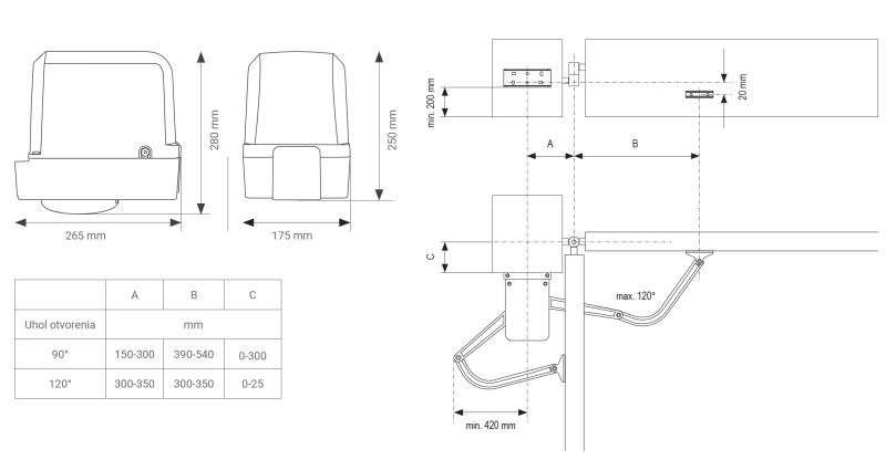 Samostatný pohon pre automatizáciu krídlových brán s krídlom 2,5m/250kg.