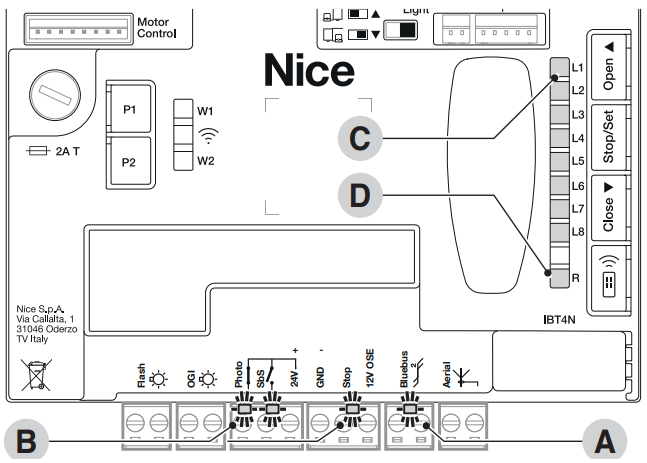 Pohon disponuje dvoma LED diódami: zelená signalizuje pohyb, červená aktívne fotobunky, neštandardné stavy a chyby. Spínač koncových dorazov je indukčný. Ovládanie a nastavenie funkcií je možné aj pomocou mobilnej aplikácie My Nice Pro (Android/iOS).