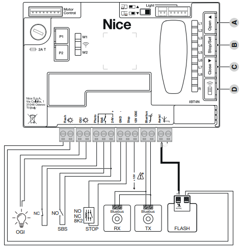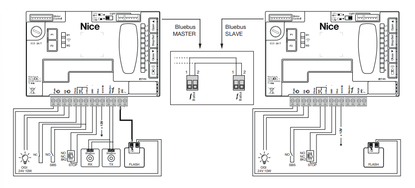 Elektrické zapojenia externých zariadení ( fotobunky, výstražný maják a pod.) boli v rodine NICE Robus RBS zjednodušené technológiou BlueBUS, ktorá dovoľuje zapojenie viacerých zariadení do spoločného konektora pomocou jedného dvojžilového kábla (bez nutnosti dodržiavať polaritu). K riadiacej jednotke je možné pripojiť aj klasické relátkové fotobunky. Riadiaca jednotka MCU1 má aj vstup OSE (Optoelectronic Safety Edge) max. 15 mA.