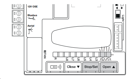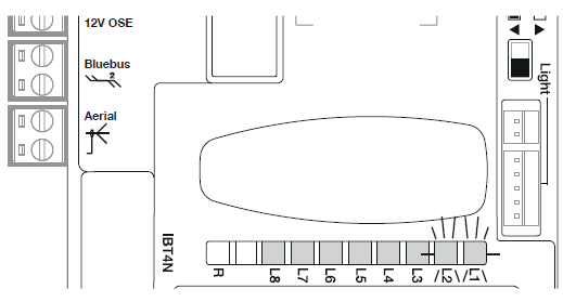 Pomocou LED diód, červenej a zelenej, identifikuje normálny chod a základnú diagnostiku brány uvedenú v tabuľke nižšie. Ak pohon zistí nejakú anomáliu/chybu, signál vydá pomocou majáku.