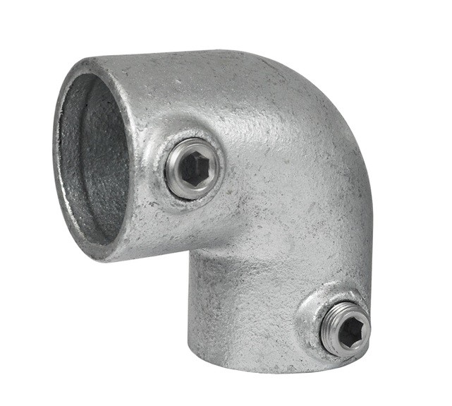 Pozinkovaná spojka trubiek v tvare L, teda s uhlom kolena 90°. Tento tvar spojky je využívaný ako koncový tvar smeru trubky, napríklad na konci vrchnej časti zábradlia.