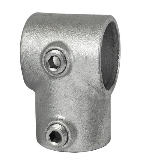 Pozinkovaná spojka trubiek v tvare úzkeho T poskytuje kolmé spojenie medzi dvoma rúrkami. Vhodná napríklad pre rovné spoje stĺpikov zábradlia.