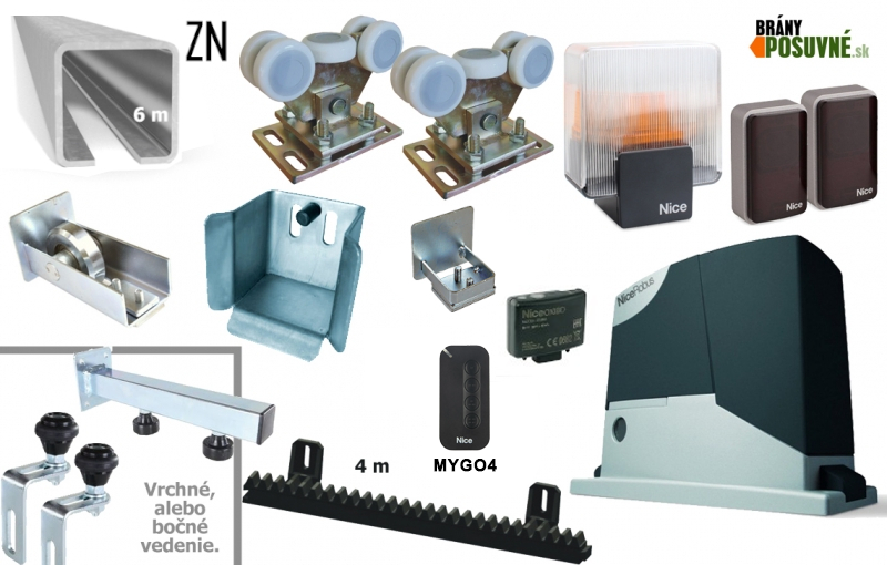 Súčasťou sady je ďalej komplet set pre automatizovanie posuvnej brány: pohon brány a elektronické príslušenstvo (ovládače, maják, fotobunky).