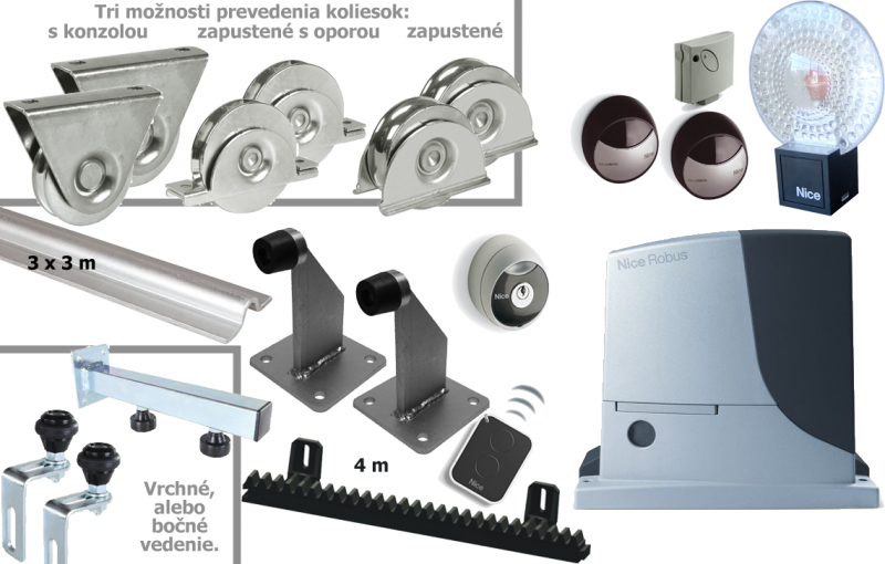 Popis produktu Sada pre výrobu koľajovej brány do 4,5 m s pohonom NICE Robus 600 a príslušenstvom