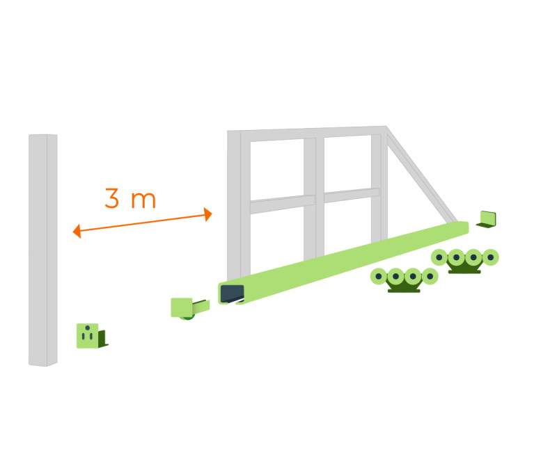 Vozík z pozinkovanej ocele má 8 kovových roliek a je umiestnený na zemi, a C-profil jazdí po nich. |