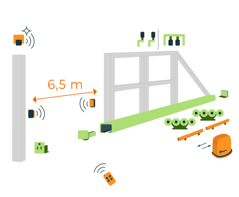 Súčasťou sady je ďalej komplet set pre automatizovanie posuvnej brány: pohon brány a elektronické príslušenstvo (ovládače, maják, fotobunky).