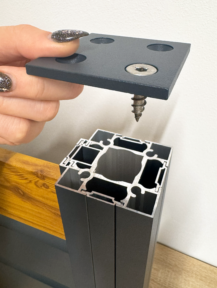 Na obrázku je samorezná skrutka so zápustnou hlavou použitá v kombinácii s hliníkovým plotovým systémom v rozmeroch 70 x 70 mm.