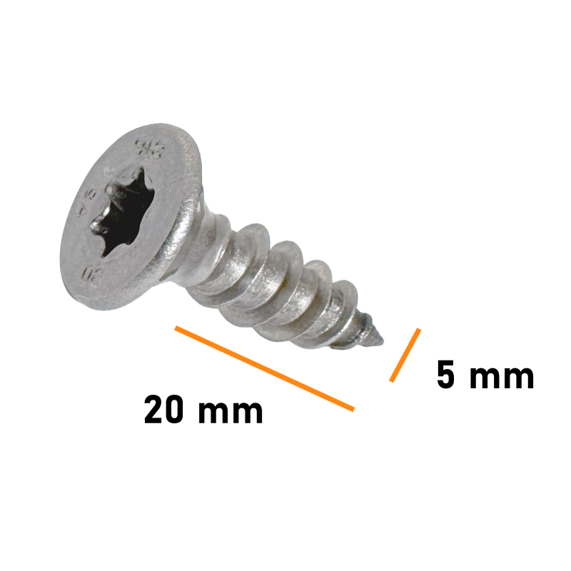 Nerezová samorezná skrutka so zápustnou hlavou s priemerom 5 mm a dĺžkou 20 mm. Priemer zápustnej hlavy je 15 mm a výška 5 mm.